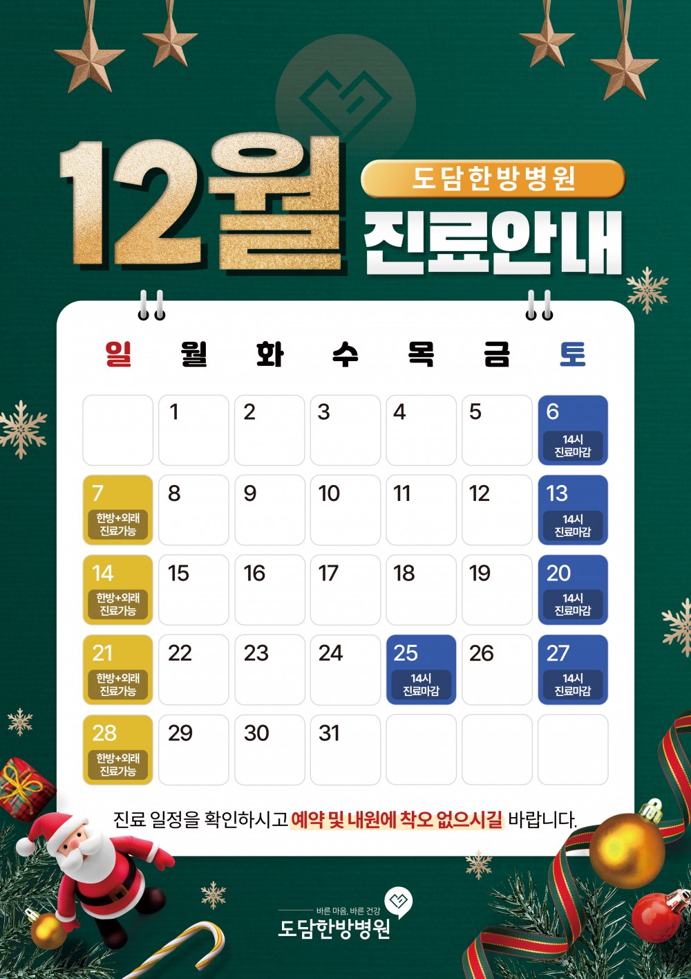 도담한방병원은 평일 오후 9시까지 야간진료하며 12/25(목) 성탄절은 오후 2시까지 진료합니다.