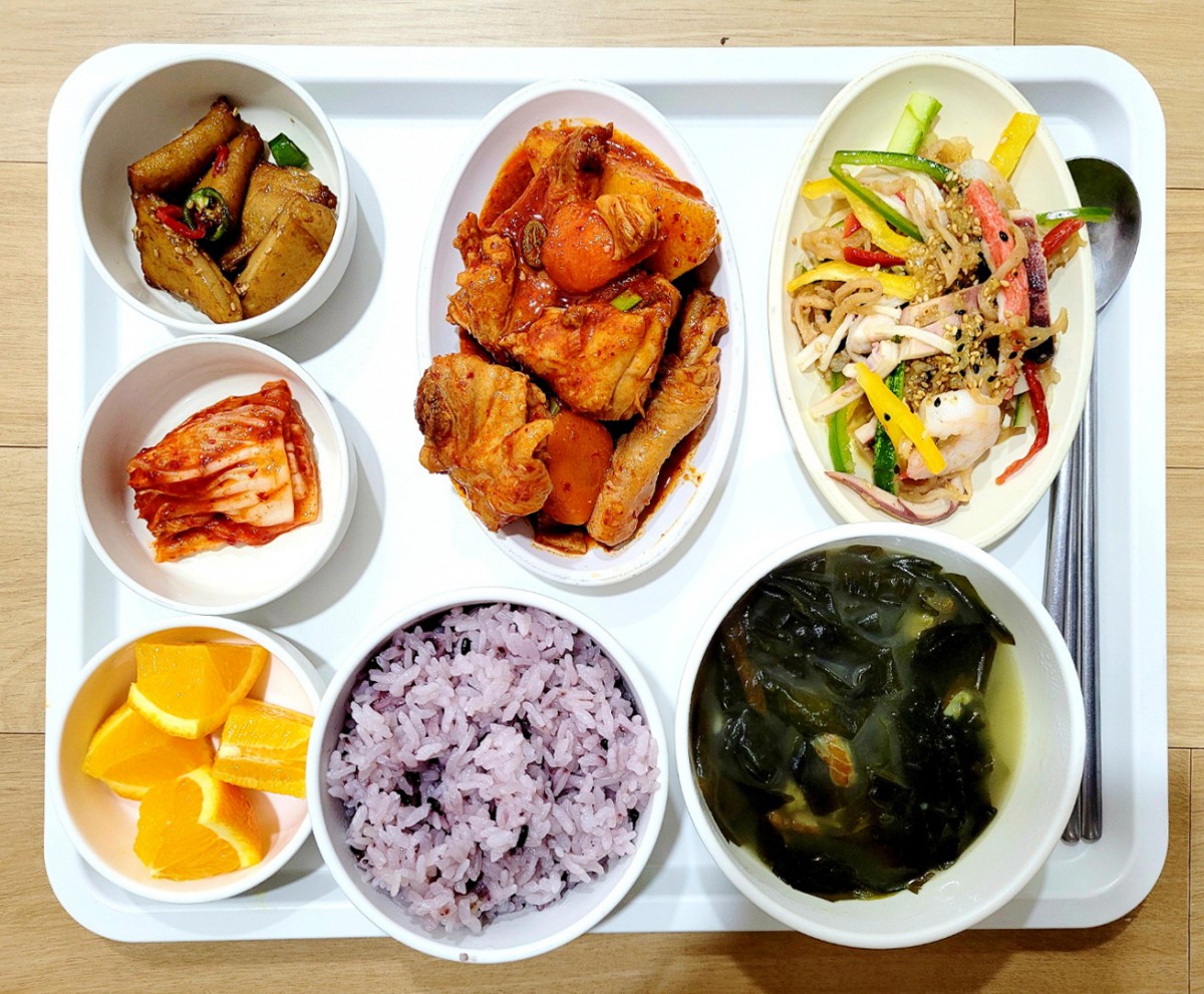 흑미밥, 황태미역국, 닭볶음탕, 해파리냉채, 가마보꼬볶음, 포기김치, 오렌지