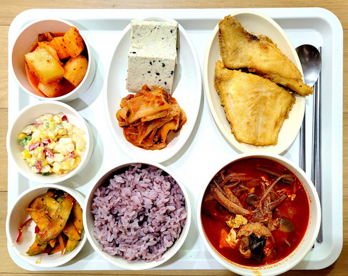 흑미밥, 버섯육개장, 가자미구이, 김치볶음+깨두부, 오이무침, 옥수수콘샐러드, 깍두기