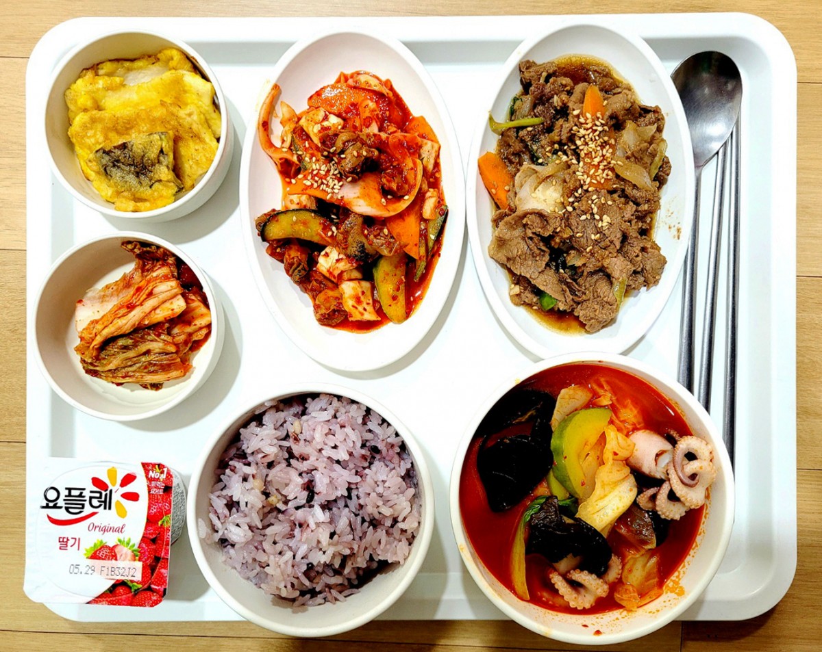 흑미밥, 짬뽕국, 소불고기, 골뱅이야채무침, 새송이전, 요플레