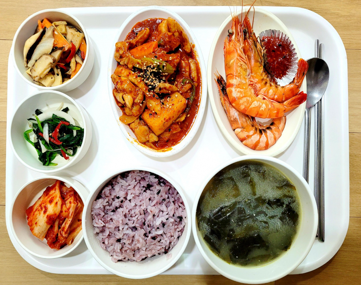 흑미밥, 들깨미역국, 닭갈비, 블랙타이거+초장, 표고죽순볶음, 시금치무침, 포기김치