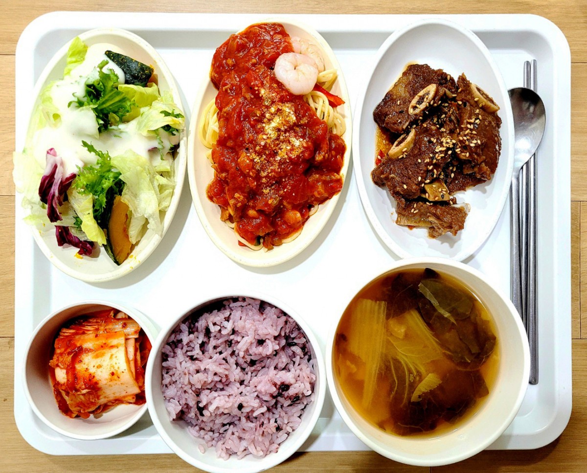 흑미밥, 배추된장국, 소갈비찜, 스파게티, 양상추샐러드+요거트드레싱, 포기김치, 바나나