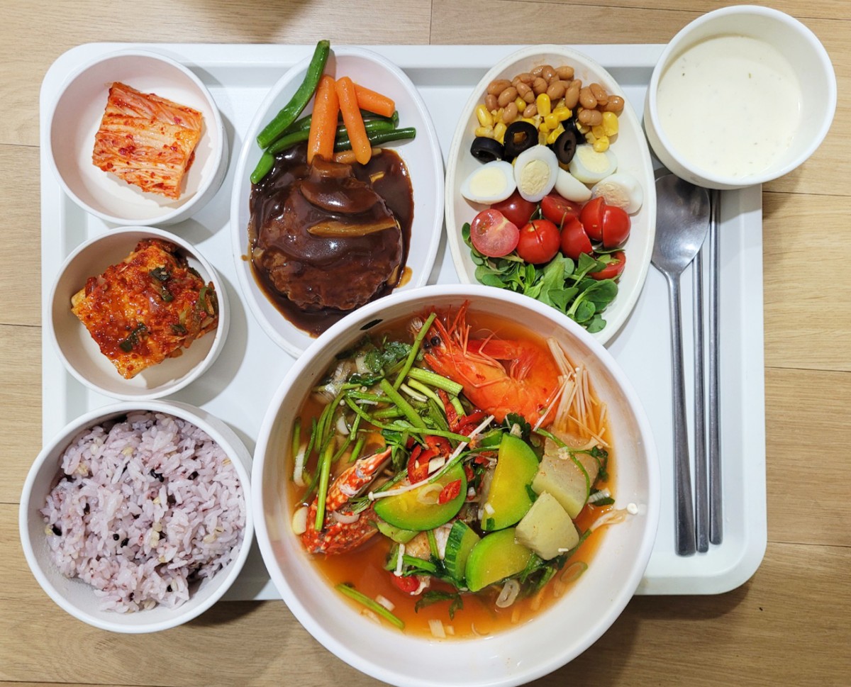 흑미밥, 꽃게탕, 함박스테이크, 콥샐러드, 두부조림, 포기김치