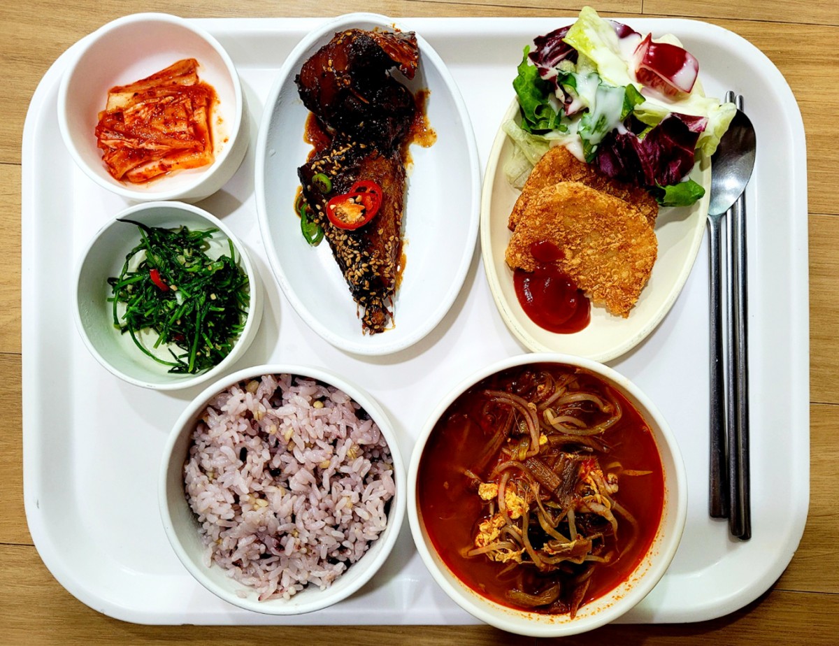 흑미밥, 육개장, 코다리엿장조림, 해쉬브라운+야채, 세발나물, 포기김치