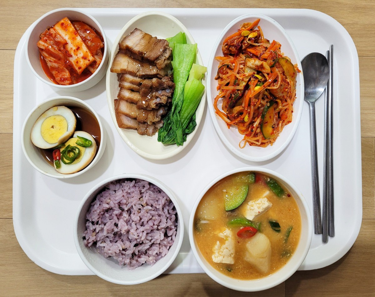 흑미밥, 조갯살된장찌개, 동파육, 골뱅이쫄면무침, 계란장조림, 포기김치