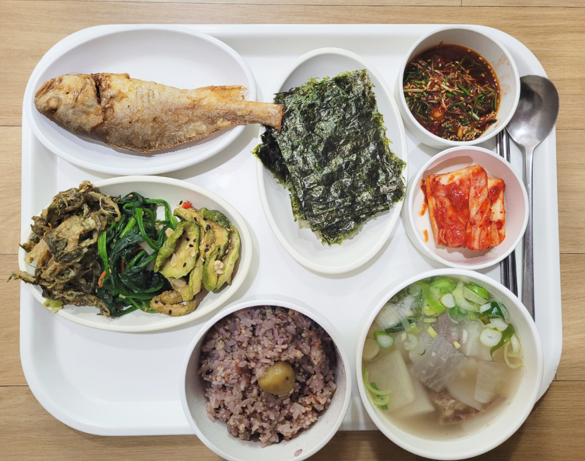 오곡밥, 소고기무우국, 조기구이, 삼색나물, 구이김+달래장, 포기김치