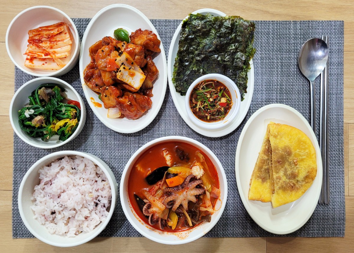흑미밥, 짬뽕국, 닭데리야끼조림, 구이김+달래장, 섬초무침, 포기김치, 호떡