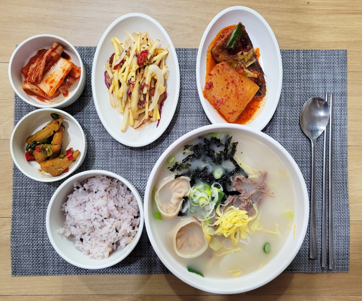 흑미밥, 떡만두국, 수삼야채무침, 임연수조림, 가마보꼬볶음, 포기김치