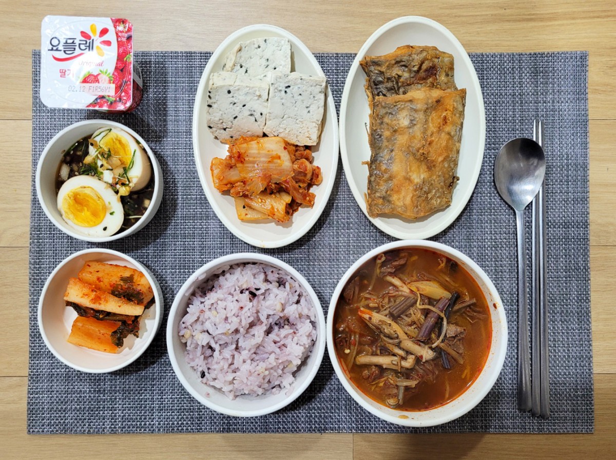 흑미밥, 육개장, 갈치구이, 볶은김치+흑임자두부, 반죽장조림, 알타리, 요플레