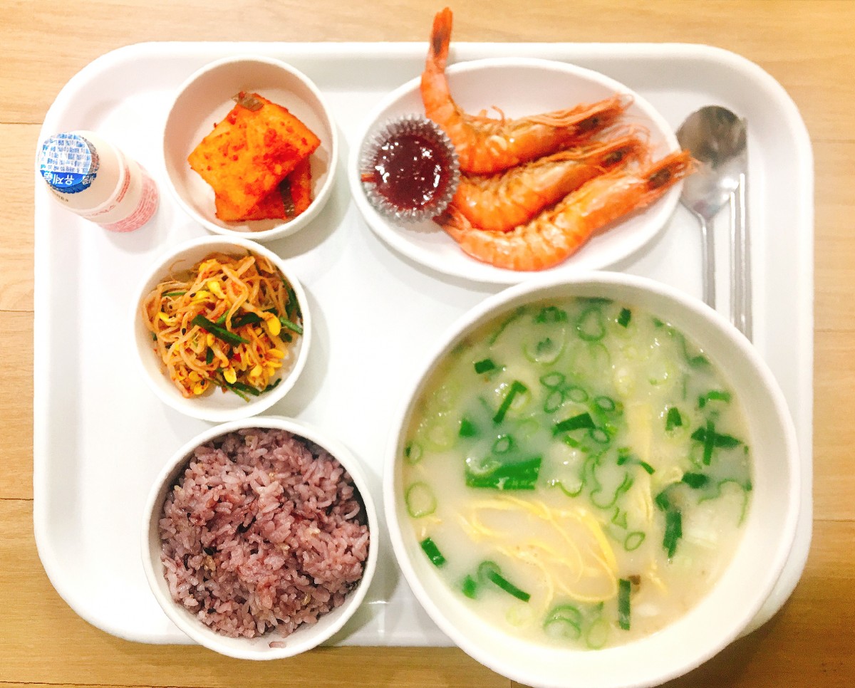 흑미밥, 설렁탕, 찐새우+초장, 콩나물무침, 석박지, 야쿠르트
