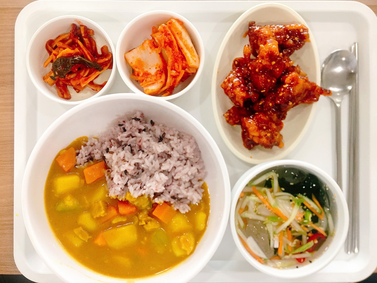 흑미밥, 카레라이스, 오이미역냉국, 닭강정, 무말랭이무침, 배추김치