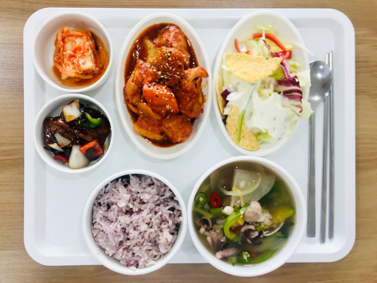 흑미밥, 연포탕, 닭볶음탕, 양상추샐러드+요거트소스, 섭산적조림, 포기김치