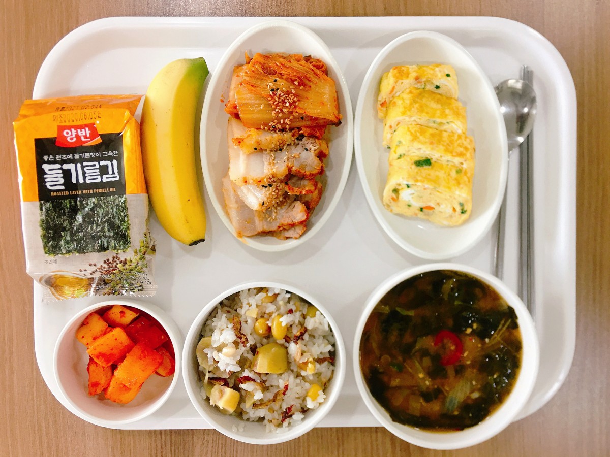 영양밥, 아욱국, 통삽겹김치찜, 계란말이, 깍두기, 김, 바나나