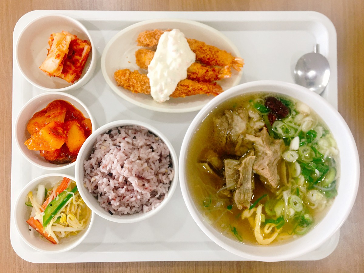 흑미밥, 갈비탕, 새우튀김+타르소스, 콩나물겨자채무침, 감자고추장조림, 포기김치