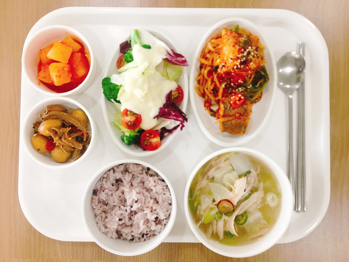 흑미밥, 닭무우국, 아귀찜콩나물찜, 양상추샐러드, 안심메알장조림, 깍두기