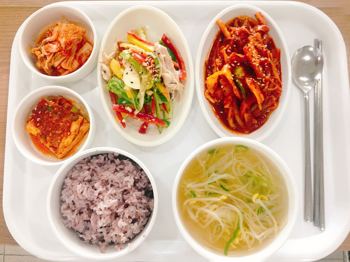 흑미밥, 콩나물국, 오징어볶음, 닭살자냉채, 두부조림, 배추김치