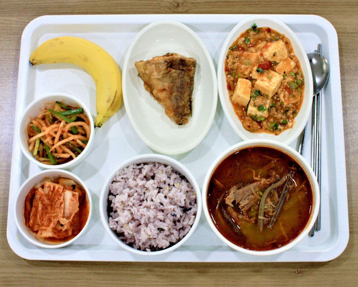 흑미밥, 육개장, 적어구이, 마파두부, 무우새콤무침, 배추김치, 바나나