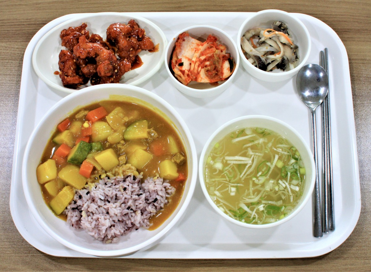 카레라이스, 콩나물국, 닭강정, 느타리초무침, 포기김치