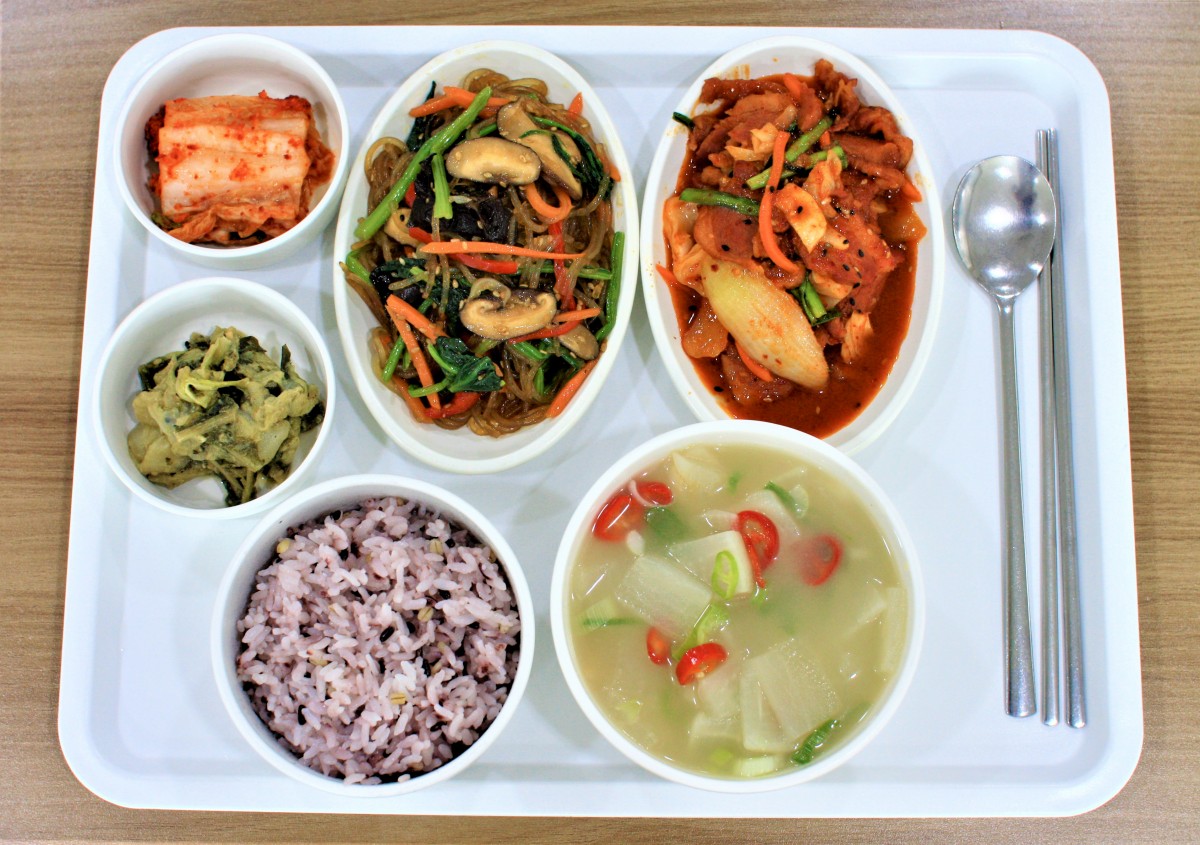 흑미밥, 북어국, 오리야채볶음, 잡채, 우거지된장지짐, 배추김치