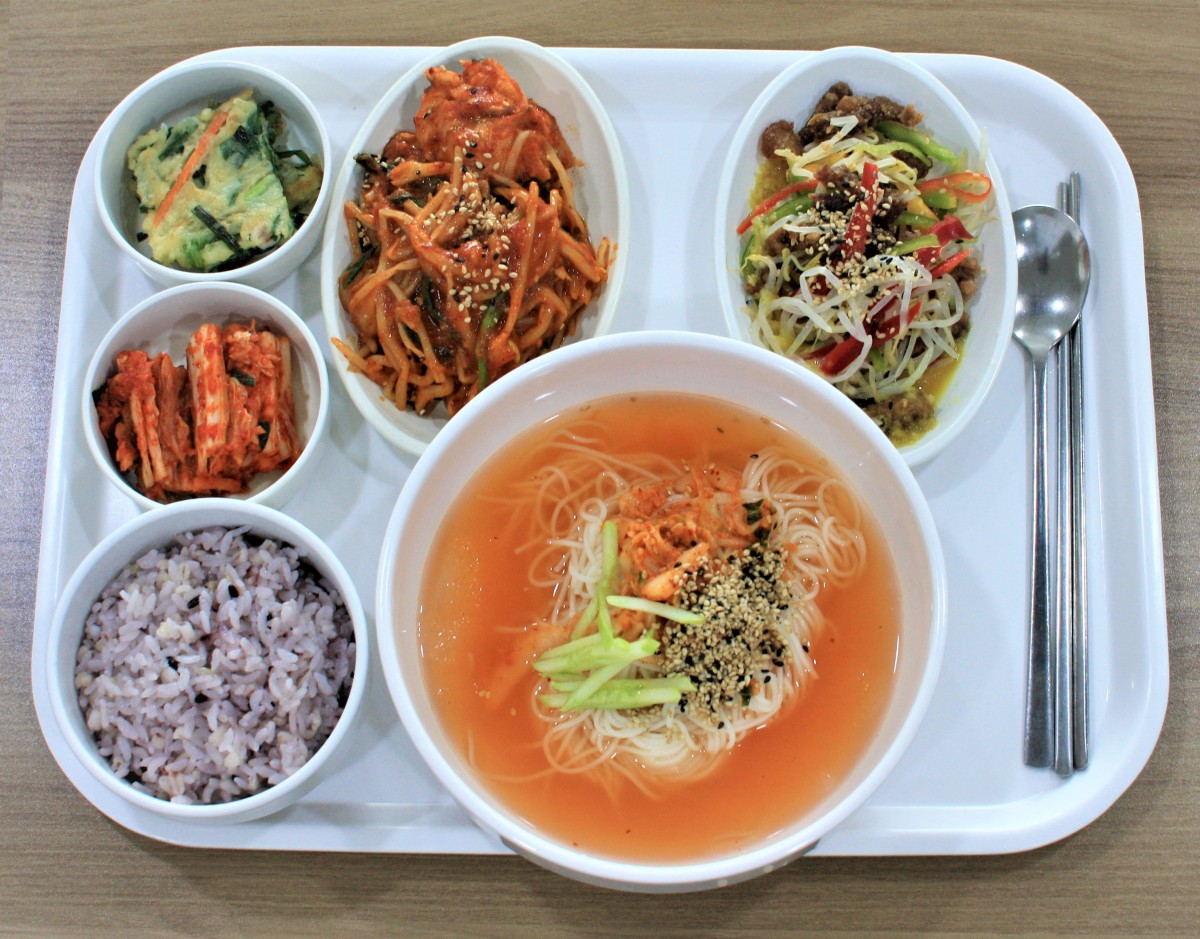 흑미밥, 김치말이국수, 아귀찜, 소고기겨자무침, 부추당근전, 배추김치