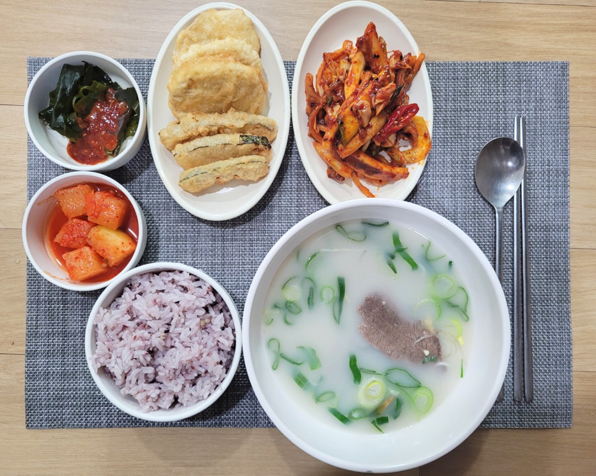 흑미밥, 설렁탕, 오징어야채볶음, 고구마+단호박튀김, 물미역+초장, 깍두기