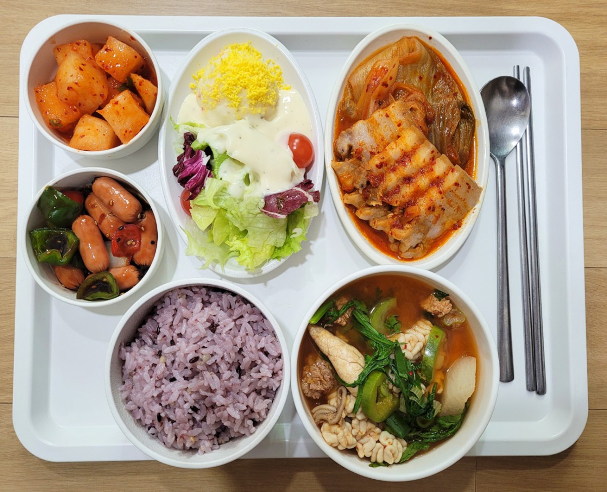흑미밥, 알탕, 삼겹살김치찜, 매쉬드포테이토샐러드, 비엔나볶음, 깍두기