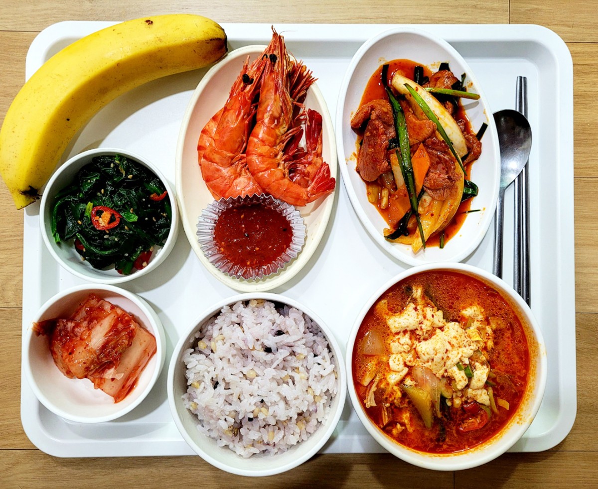 흑미밥, 순두부찌개, 훈제오리볶음, 블랙타이거+초장, 시금치나물, 포기김치, 바나나