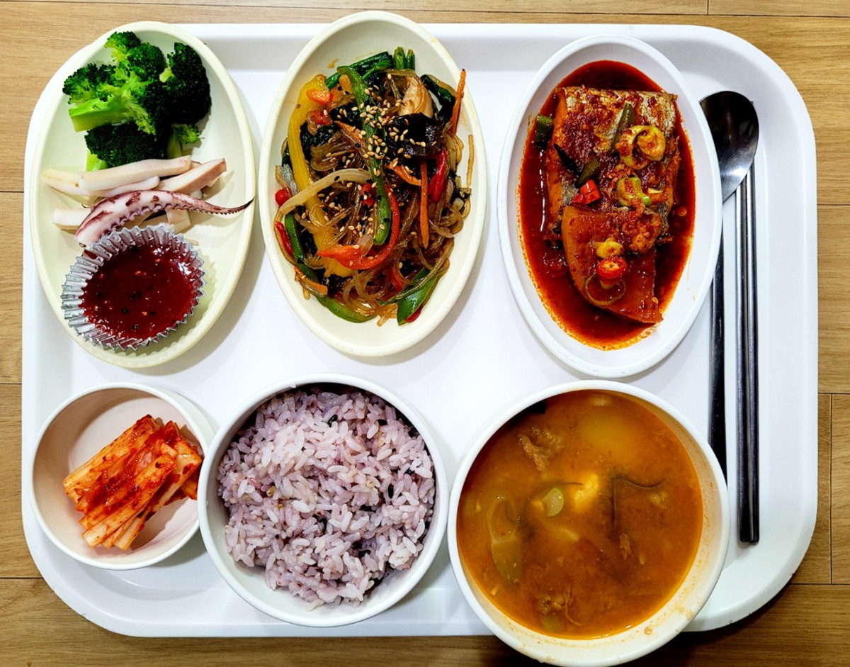 흑미밥, 차돌된장찌개, 갈치무우조림, 잡채, 오징어+브로콜리+초장, 포기김치
