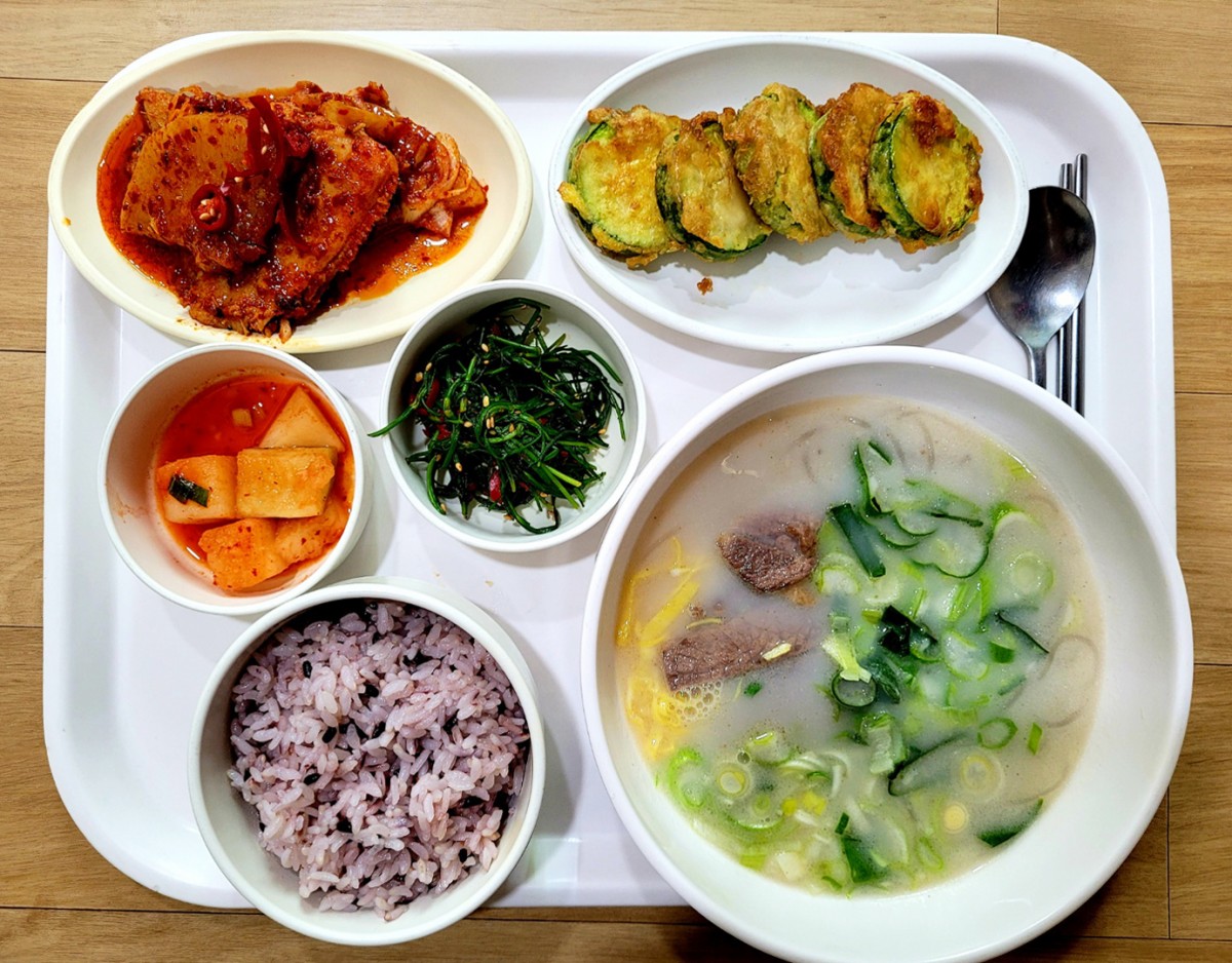 흑미밥, 설렁탕, 가자미무우조림, 애호박전, 세발나물무침, 깍두기