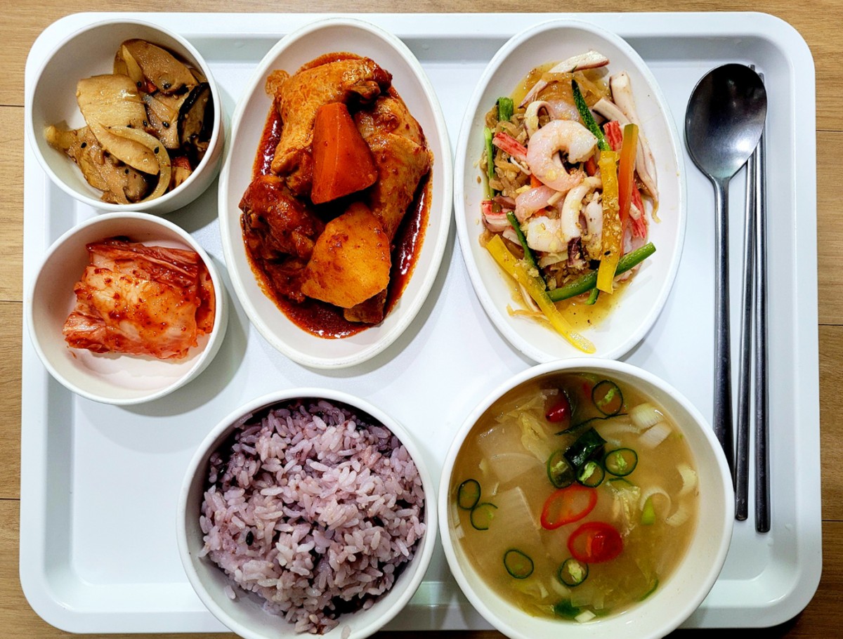 흑미밥, 콩가루배추국, 닭볶음탕, 해물냉채, 죽순표고볶음, 포기김치