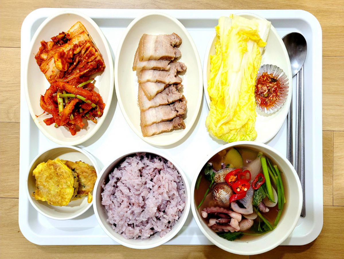 흑미밥, 연포탕, 수육+알배기쌈+새우젓, 보쌈김치+보쌈무, 동그랑땡전, 얼라이브쥬스