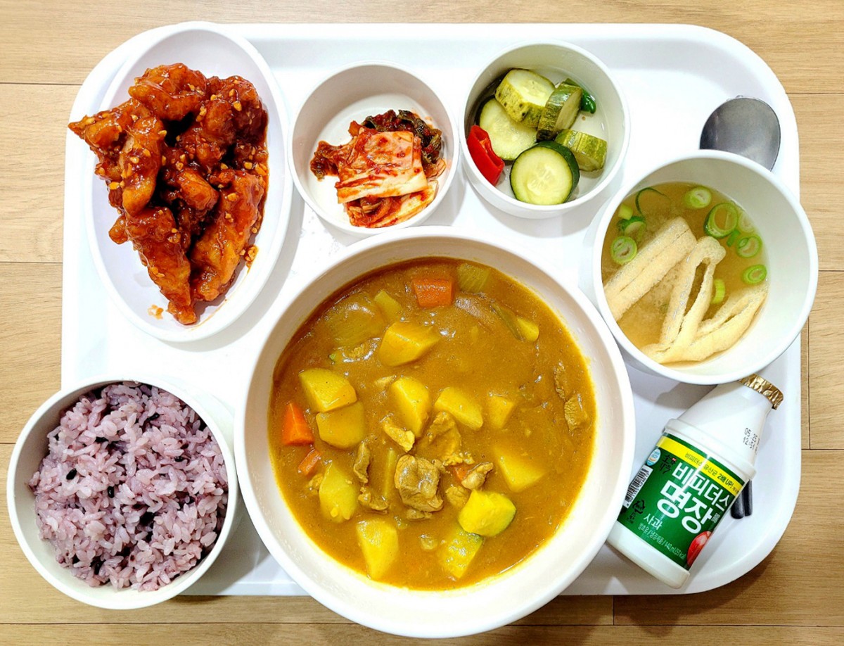 흑미밥, 카레소스, 유부장국, 닭각정, 오이피클, 김치, 비피더스
