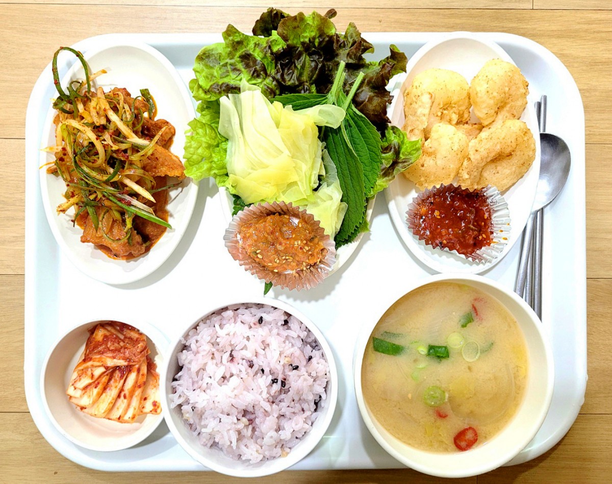 흑미밥, 배추국, 삼겹살볶음+파채+야채쌈, 깐쇼새우, 포기김치