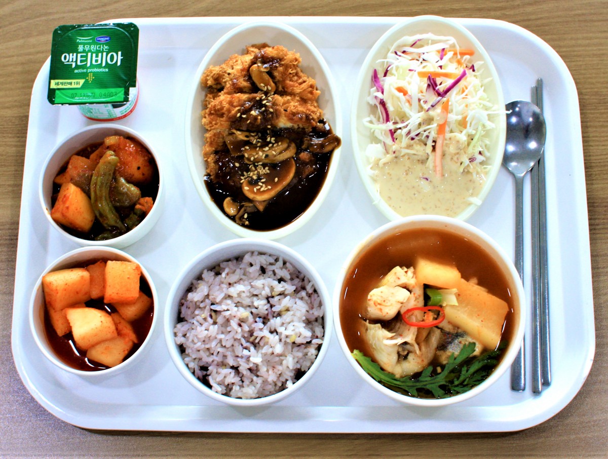 흑미밥, 대구탕, 돈까스, 양배추샐러드, 감자고추조림, 깍두기, 떠먹는 요구르트