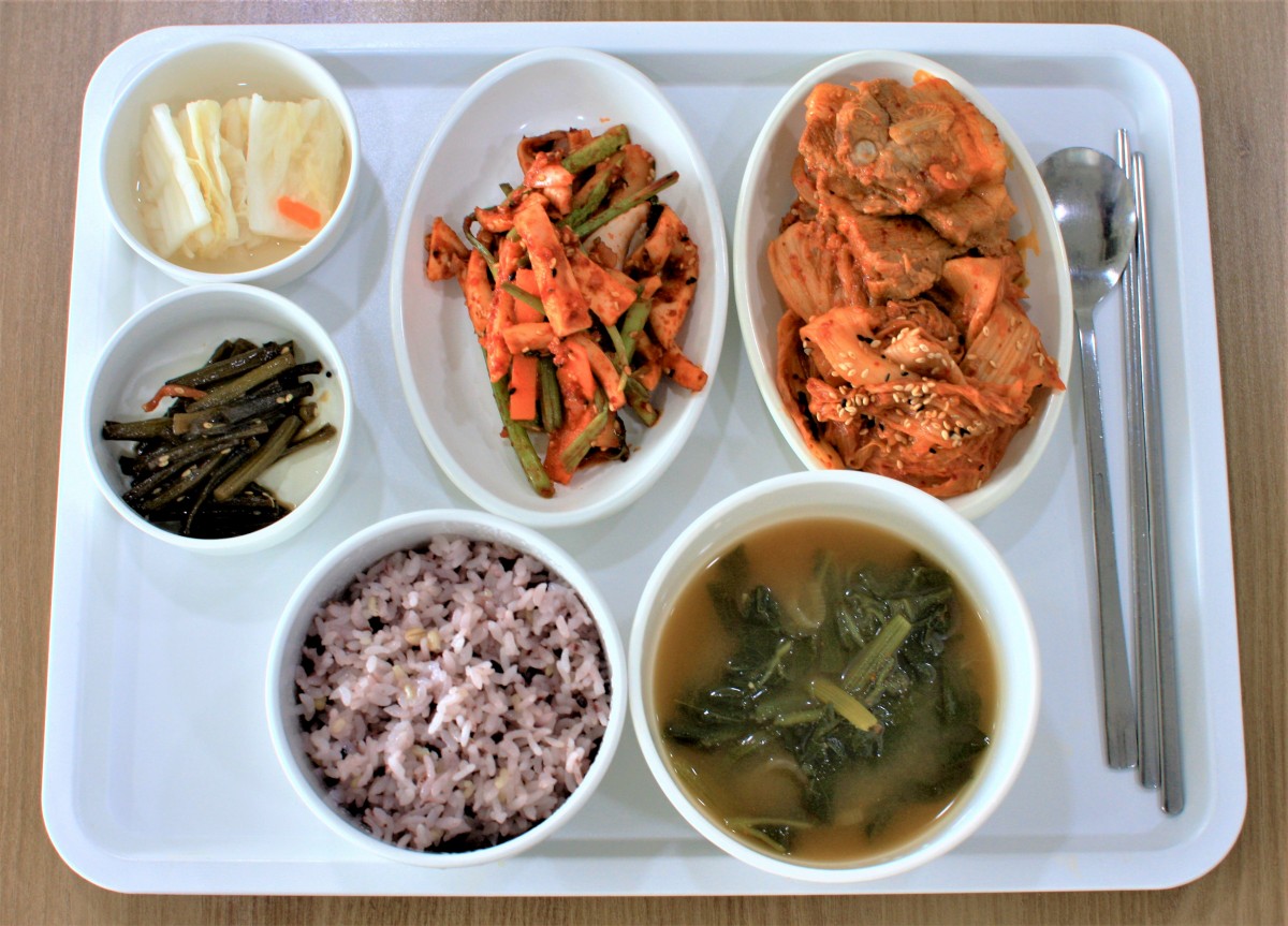 흑미밥, 호박잎된장국, 삼겹살김치찜, 오징어초무침, 마늘쫑조림, 백김치