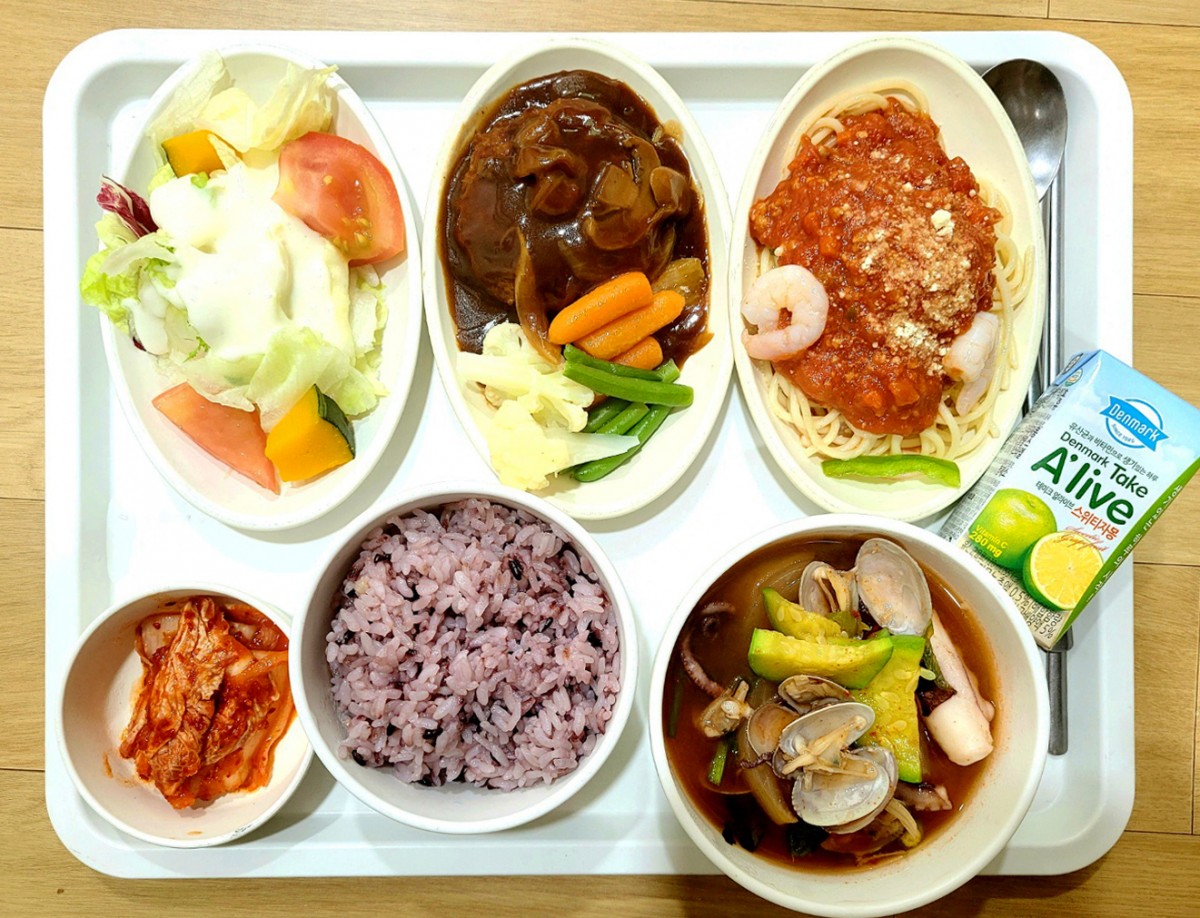 흑미밥, 낙지찌개, 함박스테이크, 토마토스파게티, 양상추샐러드+요거트드레싱, 자몽쥬스, 포기김치