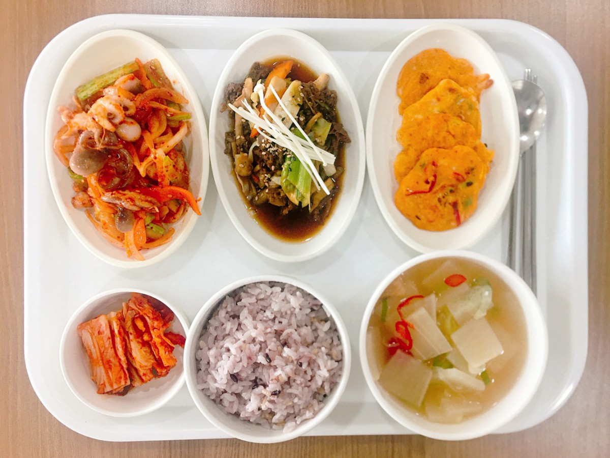 흑미밥, 북어무우국, 버섯불고기, 주꾸미야채무침, 김치전, 포기김치