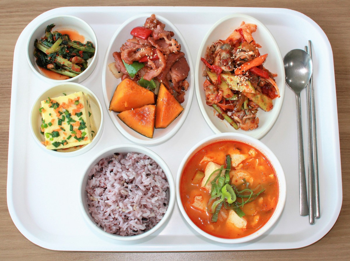 현미밥, 순두부찌개, 훈제오리단호박찜, 꼬막야채무침, 계란찜, 열무김치