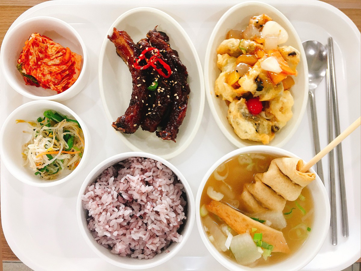 흑미밥, 꼬치어묵국, 등갈비찜, 가지만두탕수, 숙주미나리무침, 포기김치